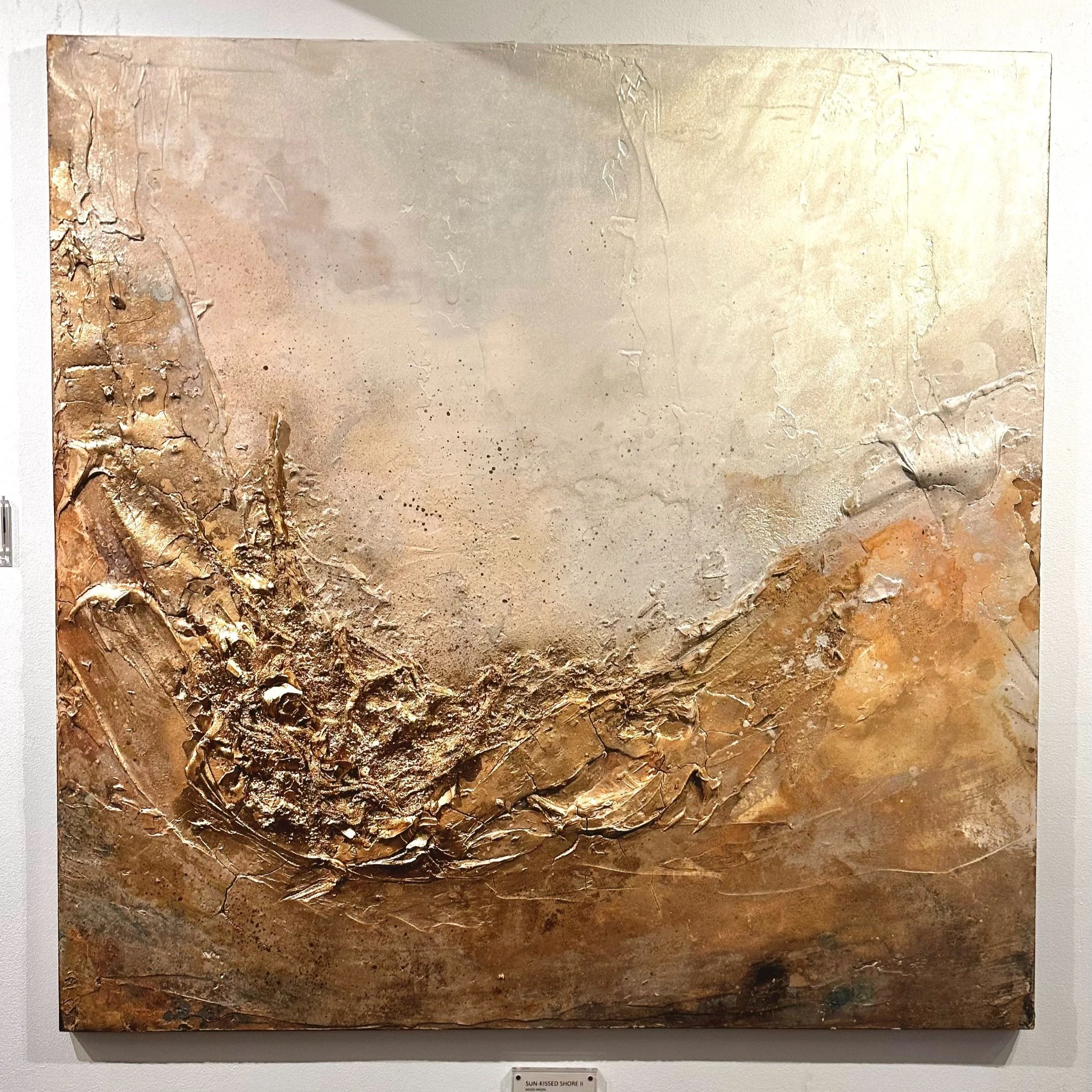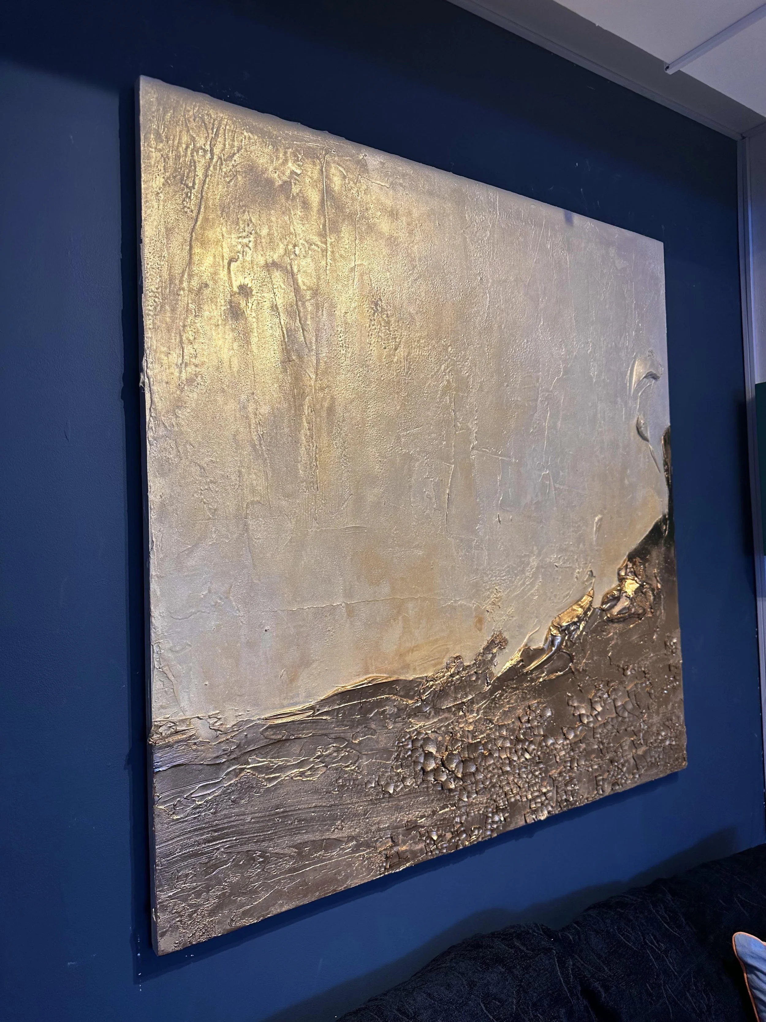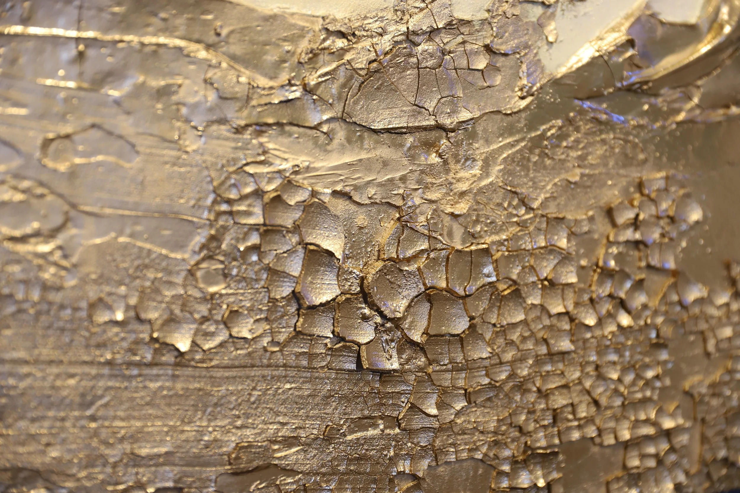 Bring elegance to your space with this gold-toned abstract textured painting, designed to captivate with its shimmering metallic highlights.