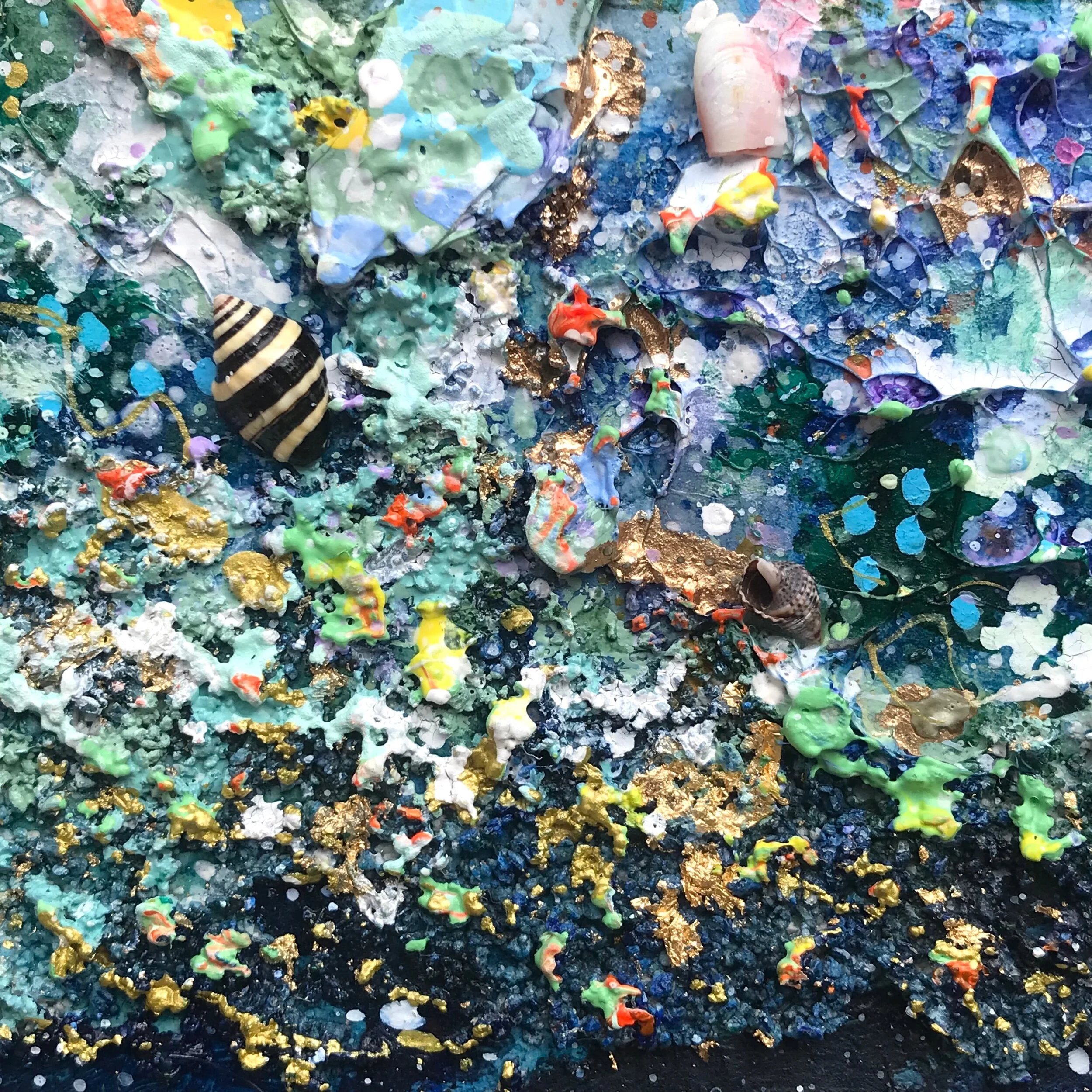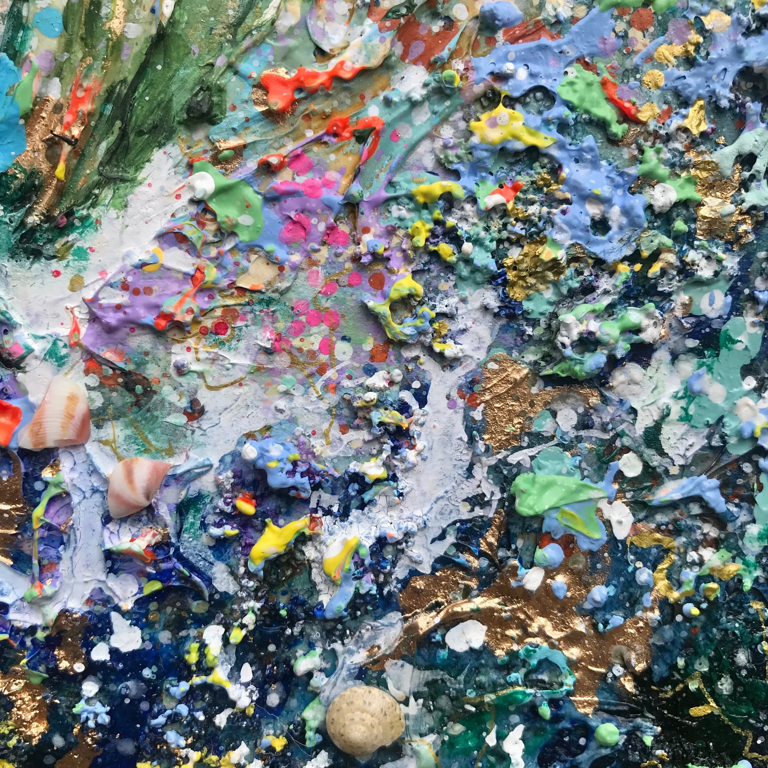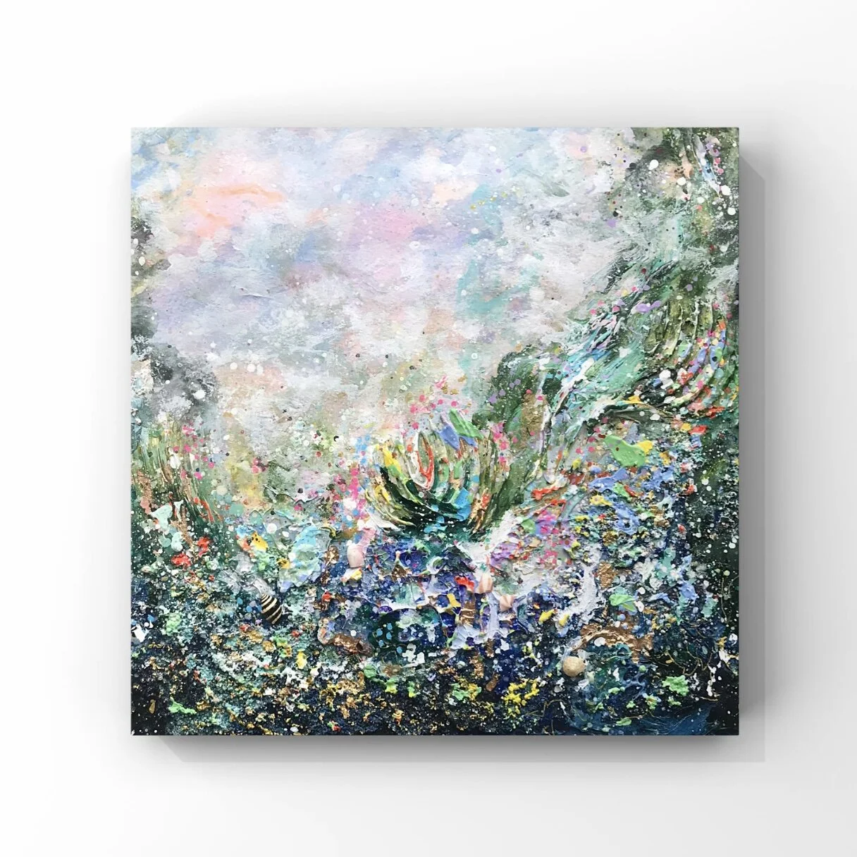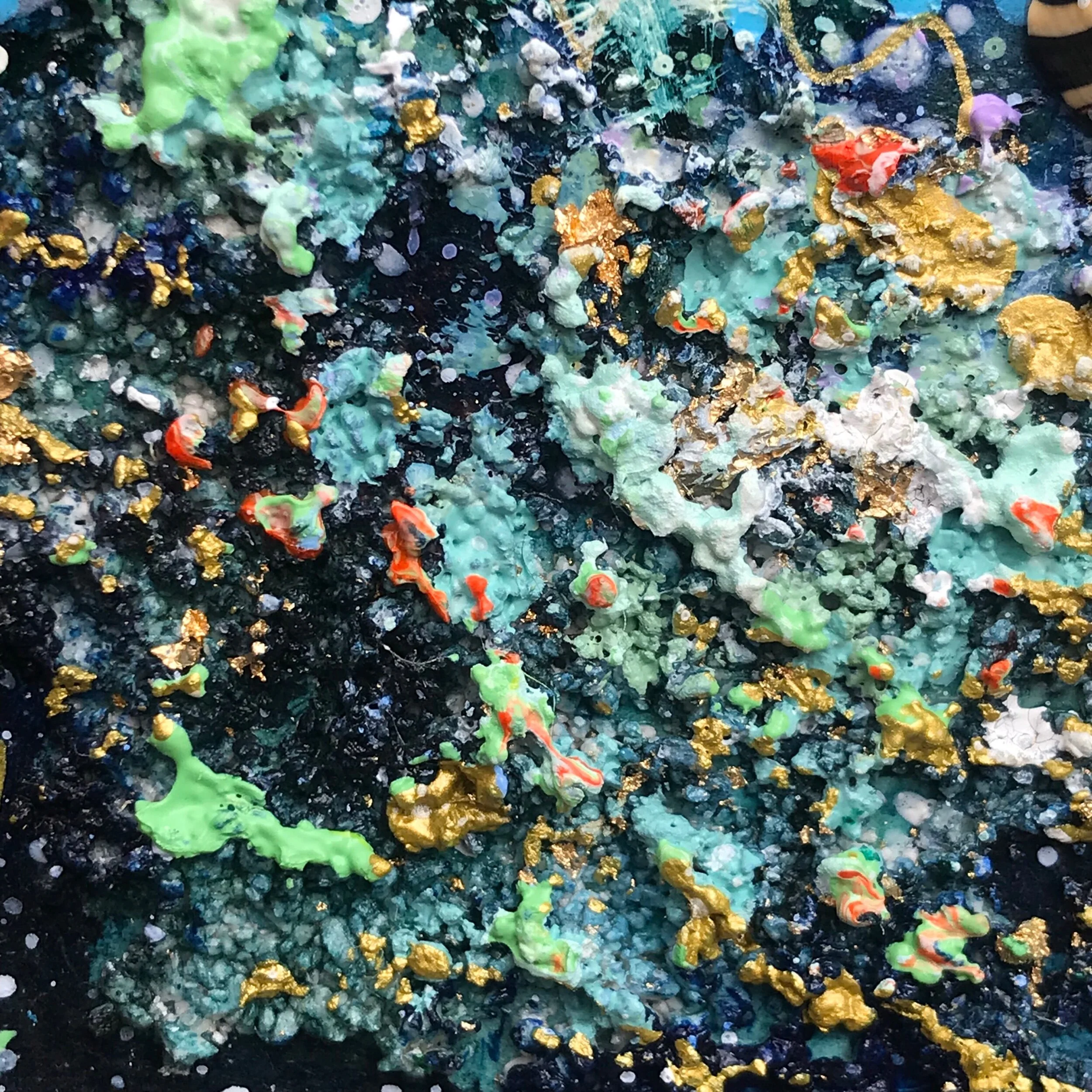 This is a mixed media painting (acrylic, watercolour, ink, crystal beads & gold dust & leaf).